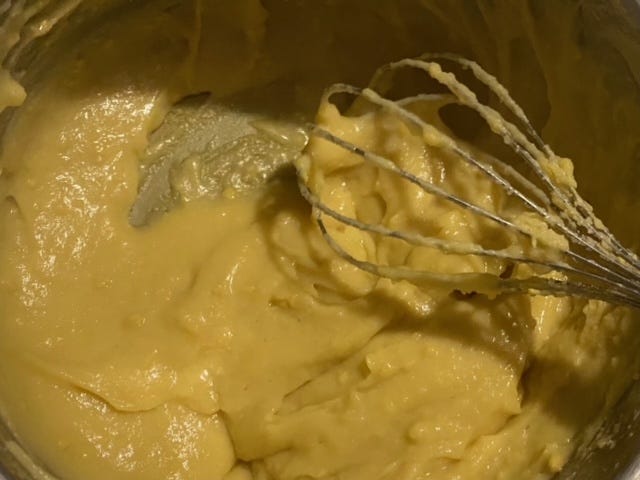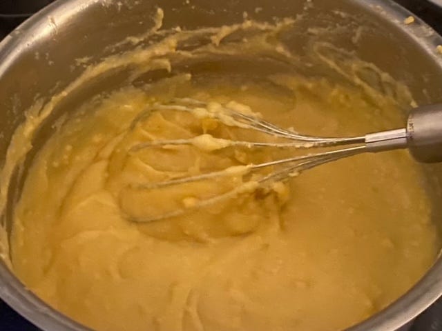 This is what the batter looks like after whisking (while listening to a podcast) for about 20 minutes over medium-low heat.