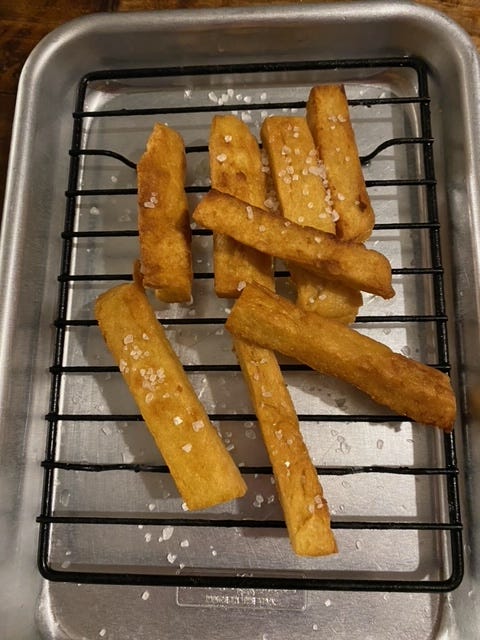 The recipe I worked from suggested whisking the batter for 20 minutes. That’s a lotta whisking for a weeknight. I mean, it was not a huge problem. It did give me an excuse not to go work out at the Y. Whisking is a form of exercise, right? And it gave me time to listen to this fascinating episode of Hidden Brain about “Rising To The Occasion” (be a Tammie Joe! Not a Francesco!) while I was whisking away. There are other recipes that call for less whisking time, but the thing about chickpea flour is that you want to make sure it cooks or soaks long enough so that all the chickpea-ness of it is cooked or soaked out. No one wants fries that taste like chickpeas. Properly prepared, these had a toasty, crunchy exterior with a creamy interior, almost the consistency of a light custard with small air pockets, and a somewhat neutral taste, kind of like French fries but more interesting.